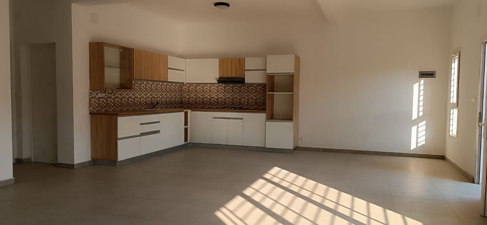 Au RDC : Un living avec une cuisine ouverte placardée et semi-équipée, 01 WC visiteur, 01 petite buanderie